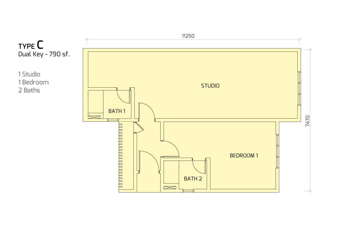 Type C: 1 Studio 1 Bedroom 2 Baths | 790 sq.ft
